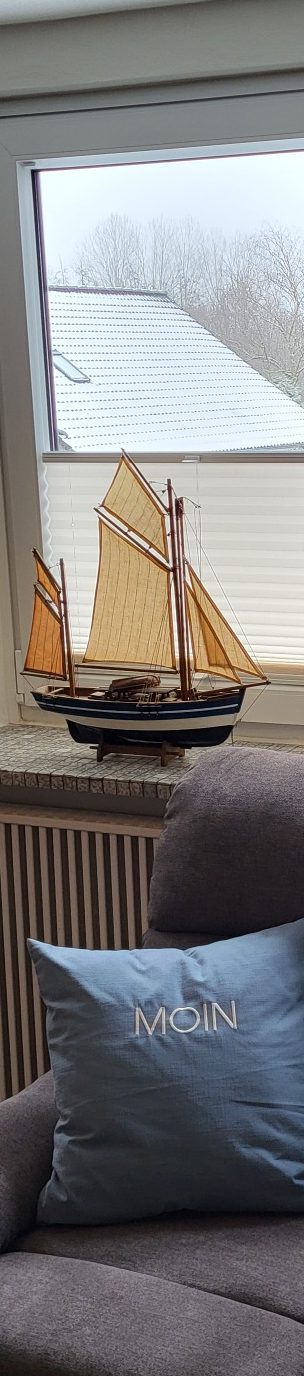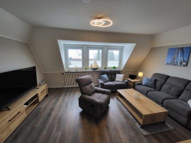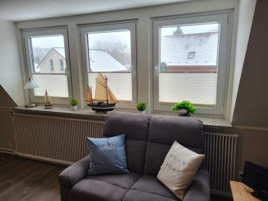 Wohnzimmer: Unser gemütliches Wohnzimmer bietet eine moderne und stilvolle Einrichtung für höchsten Komfort. Genießen Sie bequeme Sitzgelegenheiten, einen Flachbildfernseher (Netflix incl.), eine Musikanlage und kostenloses WLAN. Die maritimen Dekorationselemente schaffen eine entspannte Atmosphäre.